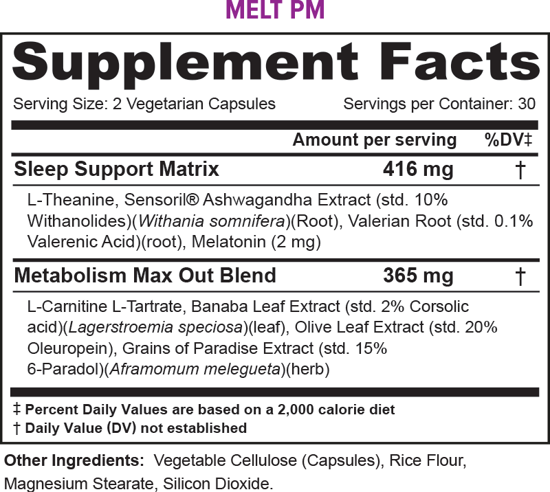 Vitauthority’s Melt PM is a premium nighttime weight loss and sleep support supplement designed to help you burn fat while promoting deep, restful sleep. Featuring L-theanine and Sensoril® Ashwagandha, this formula supports relaxation, stress reduction, and improved sleep quality without grogginess. Valerian root and melatonin work together to promote natural, non-habit-forming sleep support, while L-carnitine and Grains of Paradise enhance fat metabolism and calorie burning even while you rest. With a flexible adjustable melatonin dose, Melt PM ensures you wake up feeling refreshed and energized. Free from artificial additives, this stimulant-free, nighttime metabolism booster is the perfect way to support your weight loss and recovery goals overnight.
