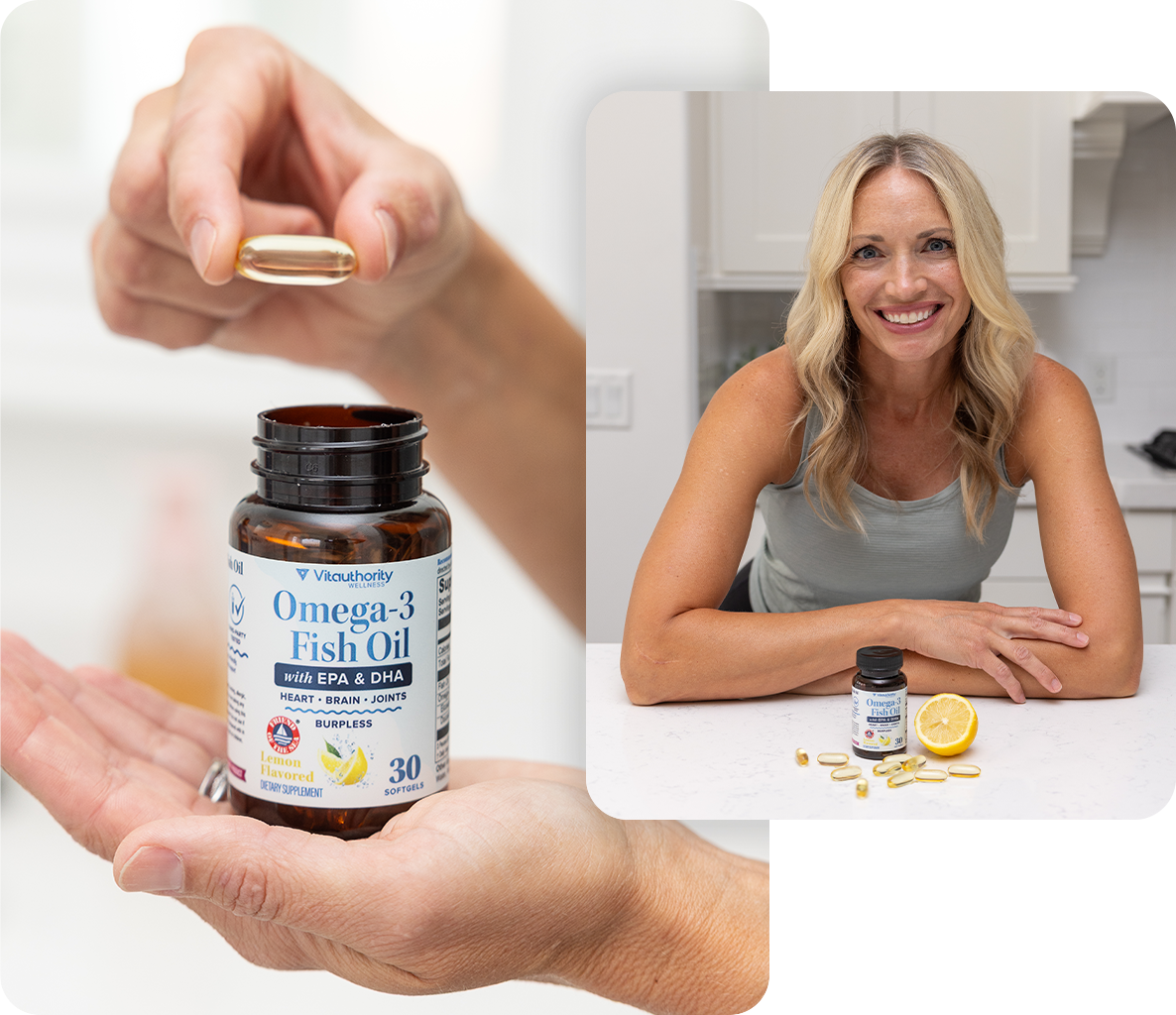 Fuel your heart, mind, and body with Vitauthority Omega-3s. Each softgel delivers 1,200 mg of high-quality fish oil, including 700 mg of total omega-3 fatty acids with 400 mg EPA and 280 mg DHA — key nutrients to help support cardiovascular health, brain function, and joint comfort. Our burpless, lemon-flavored formula makes daily supplementation easy and enjoyable, without the unpleasant aftertaste of traditional fish oils. Sustainably sourced and Friend of the Sea® Certified, every batch is gluten-free, non-GMO, and third-party tested for purity and potency.