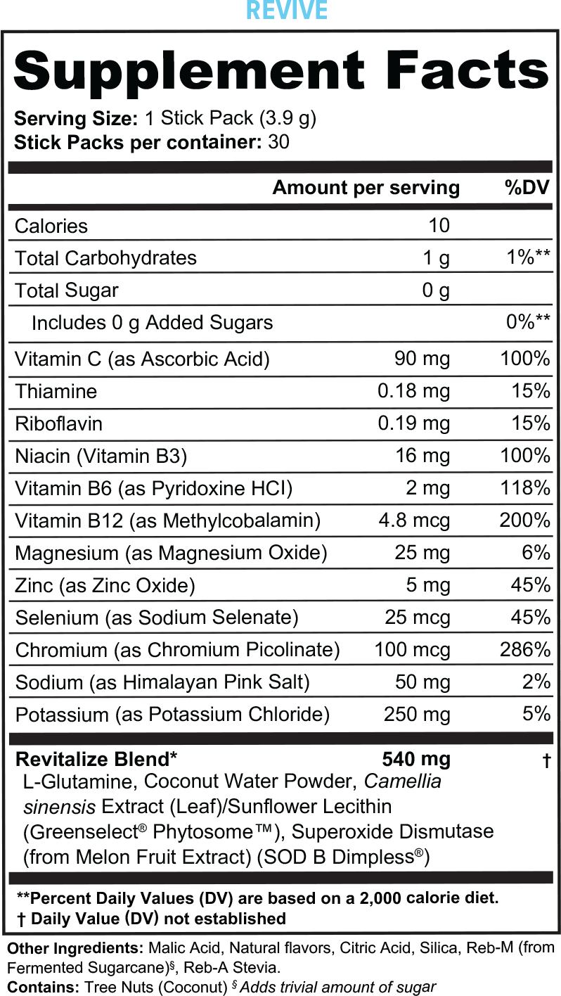 Vitauthority’s Revive Hydration is an advanced electrolyte and hydration support formula designed to help you stay hydrated, boost antioxidant protection, and support body composition naturally. Featuring coconut water powder, this formula delivers 12 essential vitamins and minerals to replenish electrolytes and maintain optimal hydration levels. Greenselect® Phytosome™, a caffeine-free green tea extract, provides powerful antioxidants to support metabolism and body weight balance, while SOD B Dimpless® is clinically studied to reduce cellulite and improve skin appearance from within. Free from artificial additives, gluten, and dairy, Revive Hydration is the perfect daily hydration solution for those looking to support whole-body wellness.
