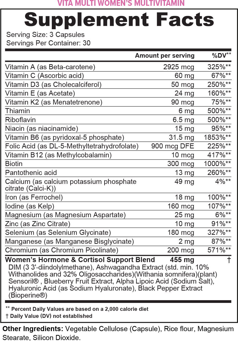 Vitauthority’s Vita Multi is a premium women’s multivitamin designed to support hormonal balance, skin health, energy, and overall wellness. Featuring Sensoril® Ashwagandha, this formula helps manage stress and promote relaxation, while DIM (Diindolylmethane) supports healthy estrogen metabolism and hormonal balance. Hyaluronic acid enhances skin hydration and elasticity, while alpha-lipoic acid provides powerful antioxidant support for cellular health. With added biotin for strong hair, skin, and nails, Vita Multi is the perfect daily essential for vibrant health. Free from artificial additives, this comprehensive women’s multivitamin helps you feel your best every day.