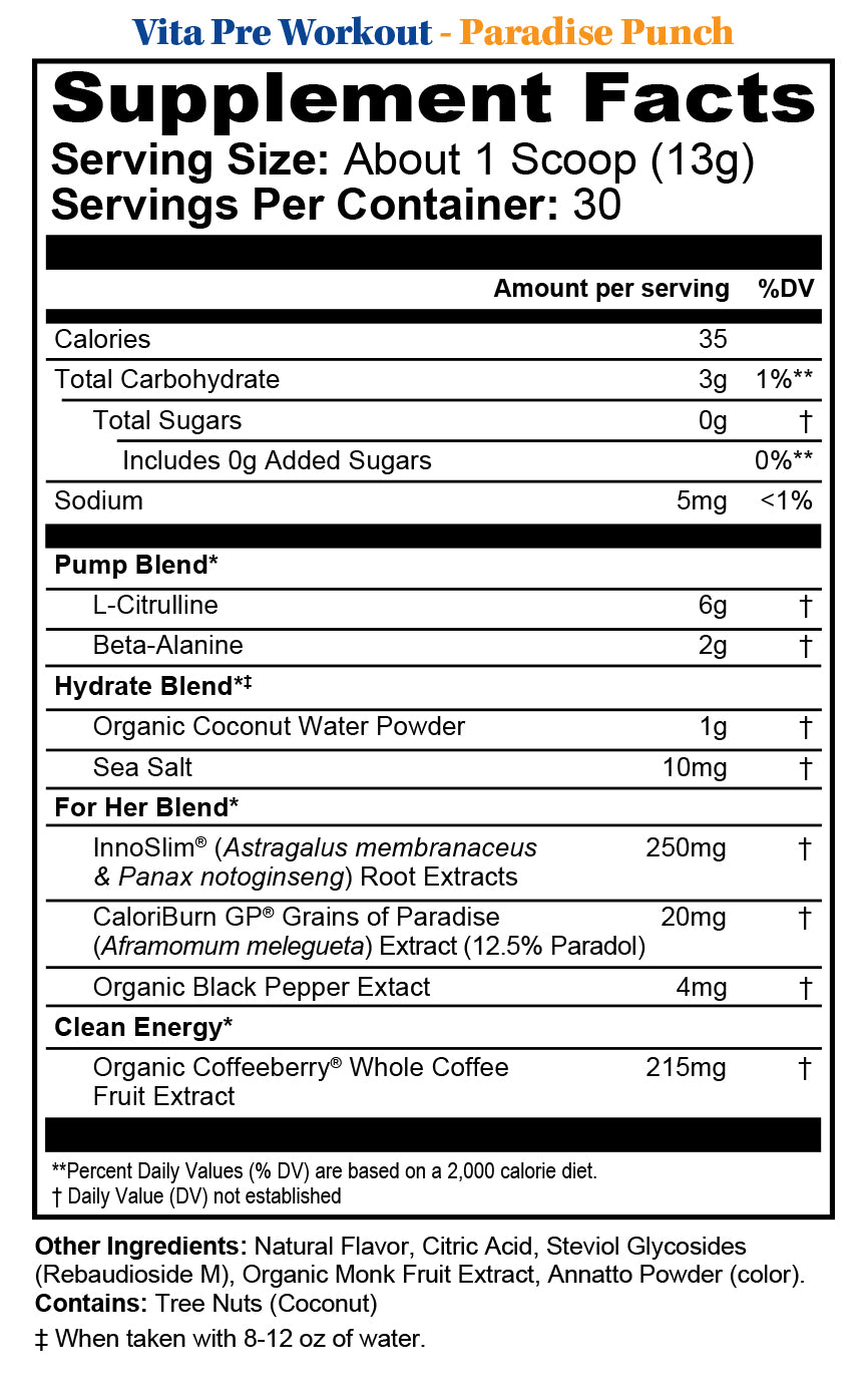 Fuel your workouts with Vita Pre-Workout Hydration Powder, the ultimate clean hydration and energy solution designed for active, health-conscious women. Packed with 6g of L-Citrulline and 2g of Beta-Alanine for enhanced endurance, 215mg of Organic Coffeeberry® for smooth, crash-free energy, and patented ingredients like CaloriBurn GP® and InnoSlim® to support metabolism, Vita Pre-Workout helps you perform at your best. Hydrate naturally with Coconut Water Powder and Sea Salt, all while enjoying zero added sugar and no artificial sweeteners. Available in refreshing Paradise Punch and vibrant Fruit Fusion, it’s the perfect way to energize, hydrate, and conquer your goals.